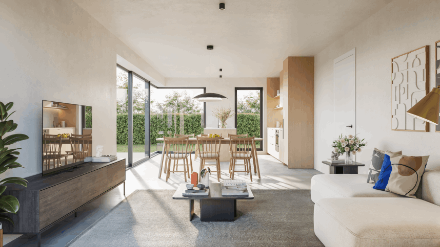 De één slaapkamer appartementen situeren zich op het gelijkvloers met zicht op de tuin.
